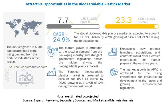 MarketsandMarketsは公開資料において、世界の生分解性プラスチック市場は2021年末までに77憶ドル、2026年までには233億ドル規模に達し、2021年から2026年までのCAGRは24.9%になるとの予測結果を発表しました。新興国での人口増加と急速な都市化、そしてエンドユース産業からの需要増加が生分解性プラスチックメーカーにとっては著しい成長機会につながることが予想されています。