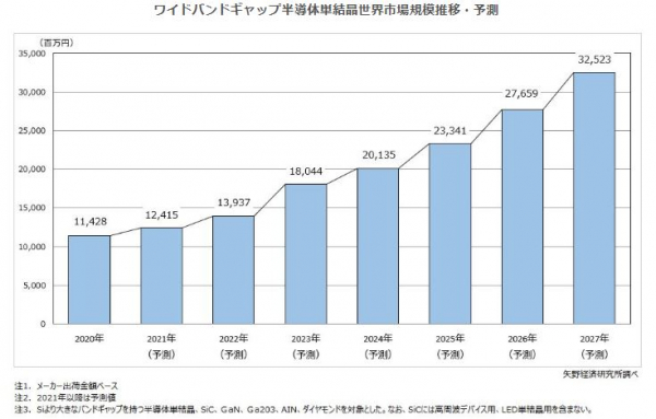 今後、パワーデバイスの本格普及や、アプリケーションへの採用種類と搭載数の増加を背景として、市場は拡大傾向にて推移し、2027年のワイドバンドギャップ半導体単結晶世界市場(メーカー出荷金額ベース)を325億2,300万円と予測する。