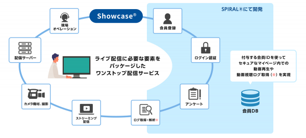 そこで、パイプドビッツが用意する開発会社向けパートナープログラム「SDP」を利用し、初期費用を抑えながら、動画配信に関する様々なニーズをパッケージ化した新サービス「Showcase(R)」を立ち上げました。なお、会員登録やメール配信、アンケート調査などのマーケティング機能は、「スパイラル(R)」を組み込んで実装しています。