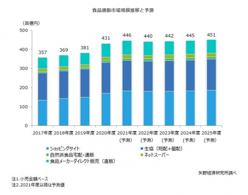 これに伴い、食品通販に対する需要は高止まりの状態が続いており、食品関連企業の業績は期初計画を上回る推移となっている。2020年度からのトレンドが続いており、2021年度の食品通販市場規模を前年度比3.5%増の4兆4,576億円になると予測する。2022年度は、2021年度は持ち越された特需の反動減になる見通しである。