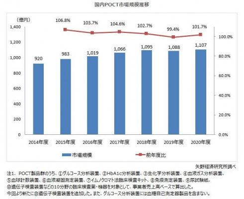 2020年度の国内POCT市場規模(10分野計)は、事業者売上高ベースで前年度比1.7%増の1,107億円となった。
