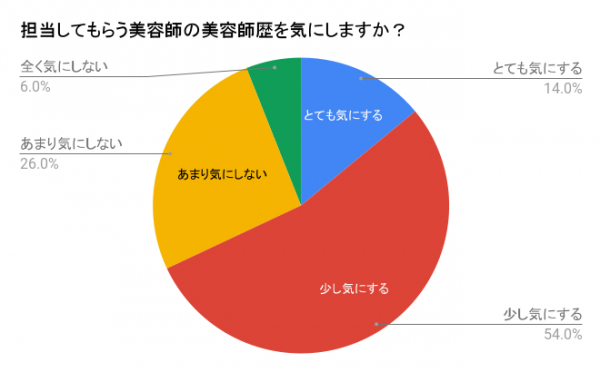「担当してもらう美容師の美容師歴を気にしますか?」の質問では、『とても気にする』が14%、『少し気にする』が54%、『あまり気にしない』が26%、『全く気にしない』が6%という結果となりました。
