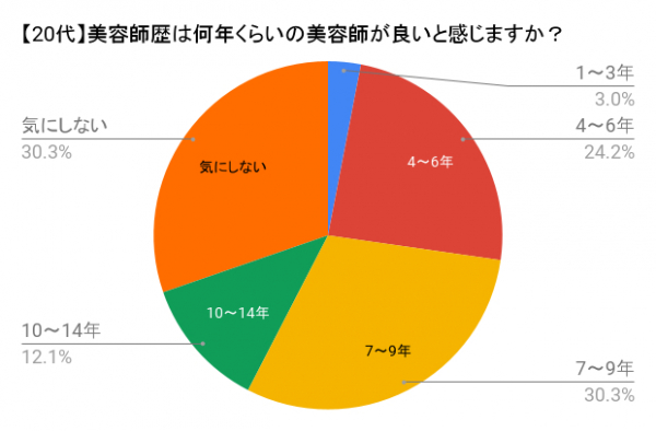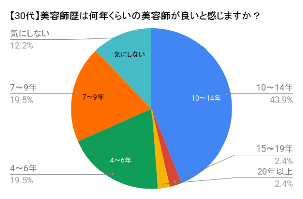 今回のアンケート調査では、全体としては約70%の方が担当者の美容師歴を「気にする」と回答し、美容師歴10~14年が一番人気となり、次いで7~9年と続きました。