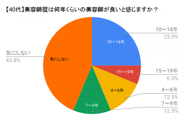 40代では半数近くの人が美容師歴を気にしないと回答。同年代と考えられる歴15年以上(35歳以上)を選んだ割合はわずか6%という結果となりました。