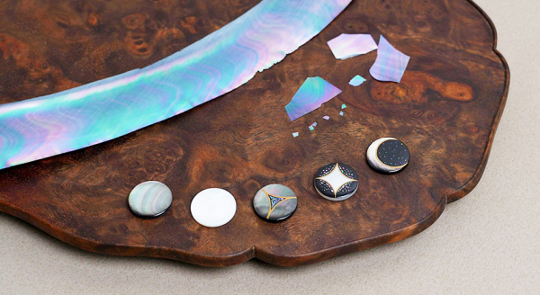 素地をお選びいただき、螺鈿の貝を切り、お好みのデザインに漆を使って貼る作業をします。