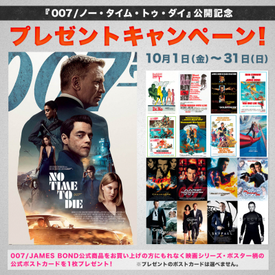 日本最大のRock&Entertainment公式グッズ・ストアPGSを運営する株式会社JAMSHOPPINGは、「007/ノー・タイム・トゥ・ダイ」の公開を記念して、007/JAMES BOND公式商品をお買い上げの方にもれなく映画シリーズ・ポスター柄の公式ポストカードを1枚プレゼントいたします。