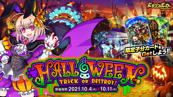 株式会社アソビズム(本社:東京都千代田区、代表取締役:大手智之)は、App Store・Google Playにて好評配信中のリアルタイム合体カードバトル『ドラゴンポーカー』で、2021年10月4日(月)より復刻スペシャルダンジョン「HALLOWEEN Trick or Destroy!」を開催いたします。