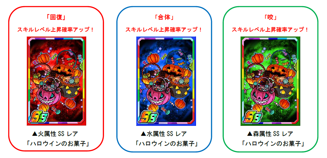 「ハロウィンP」を使い素材ガチャを回すと、限定強化素材「ハロウインのお菓子」を手に入れることができます。限定強化素材「ハロウインのお菓子」は一部のモンスターに使うと強化値2倍の効果があるほか、回復・合体・咬のスキルレベル上昇確率もアップします。