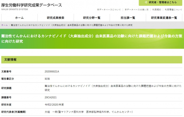 研究課題名:難治性てんかんにおけるカンナビノイド(大麻抽出成分)由来医薬品の治験に向けた課題把握および今後の方策に向けた研究