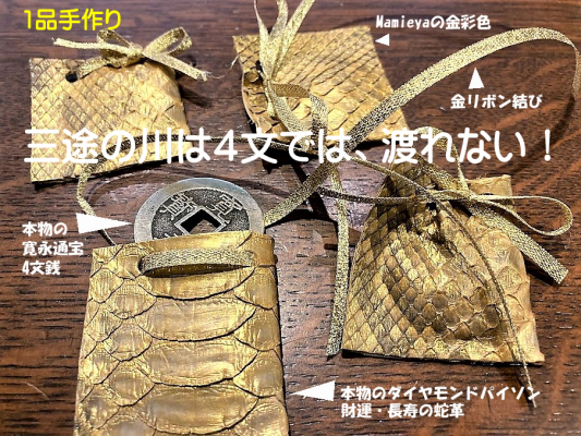 蛇革お守り袋:ダイヤモンドパイソン蛇革(金色彩色ハンドメイド)