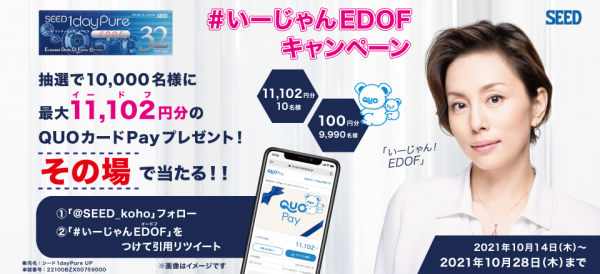 コンタクトレンズの製造販売を行う株式会社シード(本社:東京都文京区、代表取締役社長:浦壁 昌広、東証1部:7743)は、2021年10月14日(木)10:00~10月28日(木)23:59の間、公式Twitterにおいて、「#いーじゃんEDOF 引用RTキャンペーン」を開催いたします。当キャンペーンでは、今年12月に発売より3年目を迎える、日本初※・医療発の遠近両用1日使い捨てソフトコンタクトレンズ「シード1dayPure EDOF」のたくさんの方のご愛顧に感謝して、当商品のパッケージを模したオリジナルQUOカードPayが当たるキャンペーンを企画いたしました。併せて、10月14日(木)限定で米倉涼子さん出演のCMを放映いたします。