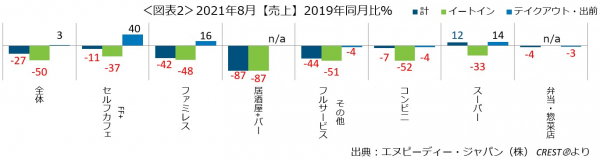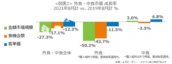 外食・中食市場の2021年8月は、売上27.3%減(2019年同月比)