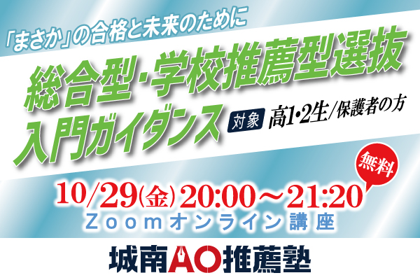 2021年10月29日(金)、株式会社城南進学研究社(所在地:神奈川県川崎市、代表取締役社長CEO:下村勝己)が運営する総合型・学校推薦型選抜対策専門塾「城南AO推薦塾」(塾長:川原洋孝)は、無料オンラインガイダンス「高1・2生対象 総合型・学校推薦型選抜入門ガイダンス」を開催いたします。