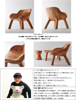 この「SHINRA(森羅)」シリーズは、こうした「小さな木材」を製材・接着して1つの大きな塊にし、3Dデータと最新の5軸NCルーターを駆使して削り出す、という独自のアプローチにより、これまでの角材・板材では難しかった、体全体を包み込むような三次元形状を実現しています。