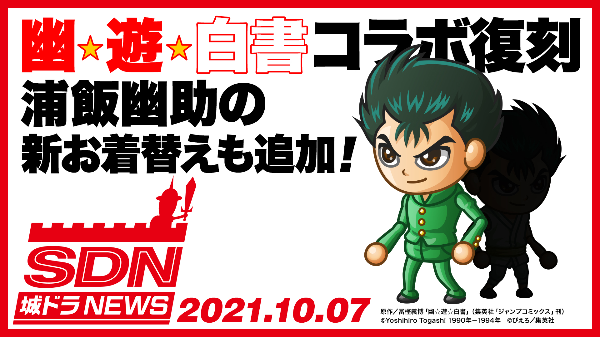 『城とドラゴン』公式YouTubeチャンネル「城ドラNEWS」(2021年10月7日公開分)にて、コラボ限定キャラ「浦飯幽助」の激レアお着替え「闘神の継承者」やコラボイベント情報を公開中!