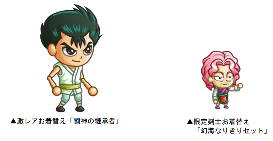 今回新たに、コラボキャラ「浦飯幽助」の激レアお着替え「闘神の継承者」や、限定剣士お着替え「幻海なりきりセット」が登場!期間限定の復刻コラボをどうぞご期待ください。