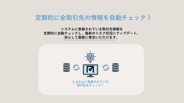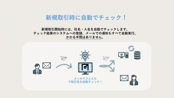 API経由で様々なアプリケーションと連携することで、「新規取引時の自動チェック」や、「定期的な全取引先の情報チェック」に活用できます。