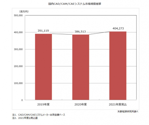 2021年度のCAD/CAM/CAEシステム市場は、前年度比4.6%増の4,042億7,300万円になると予測する。