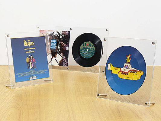 EPシングルサイズのレコードが飾れる専用額(レコードフレーム)です。レコードの形状にくり抜いたアクリル板にレコードを収め、前後をアクリル板で挟み込みます。