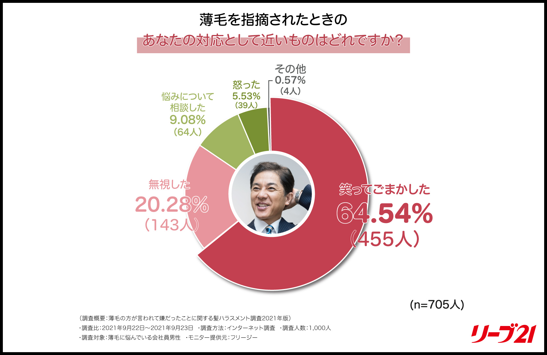 株式会社毛髪クリニック リーブ21(本社:大阪市中央区、代表取締役社長:岡村勝正 以下「リーブ21」)は、10月20日(水)の頭髪の日に向けて、薄毛の悩みを持つ全国の会社員男性1000人を対象に髪ハラスメント(以下、「髪ハラ」(R))に対する調査を実施しました。