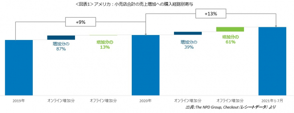 The NPD Groupの消費者レシートトラッキング分析サービスCheckoutによると、アメリカの2020年の主要小売店の売上は、9%増加しました。内訳をみると、増加分のうち87%はオンライン購入の増加によるものでした(図表1)。