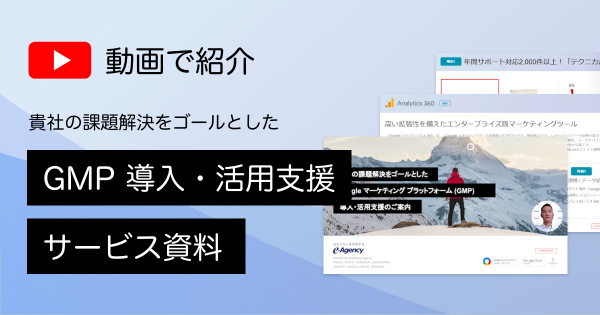 DX(デジタルトランスフォーメーション) やデータ活用の流れが加速し、イー・エージェンシーも多数のお問い合わせをいただいております。こうしたニーズの高まりにお応えするため、本動画では、Google アナリティクスをはじめとするGoogle マーケティング プラットフォームの各種ツールの導入・活用支援のサービス内容やそのメリット、活用成功事例など、資料だけではお伝えしきれなかった詳細部分を弊社アカウントエグゼクティブである後藤(ごとう)がわかりやすくご紹介します。