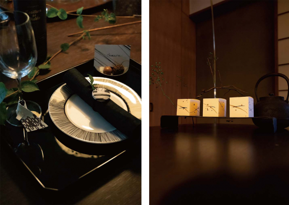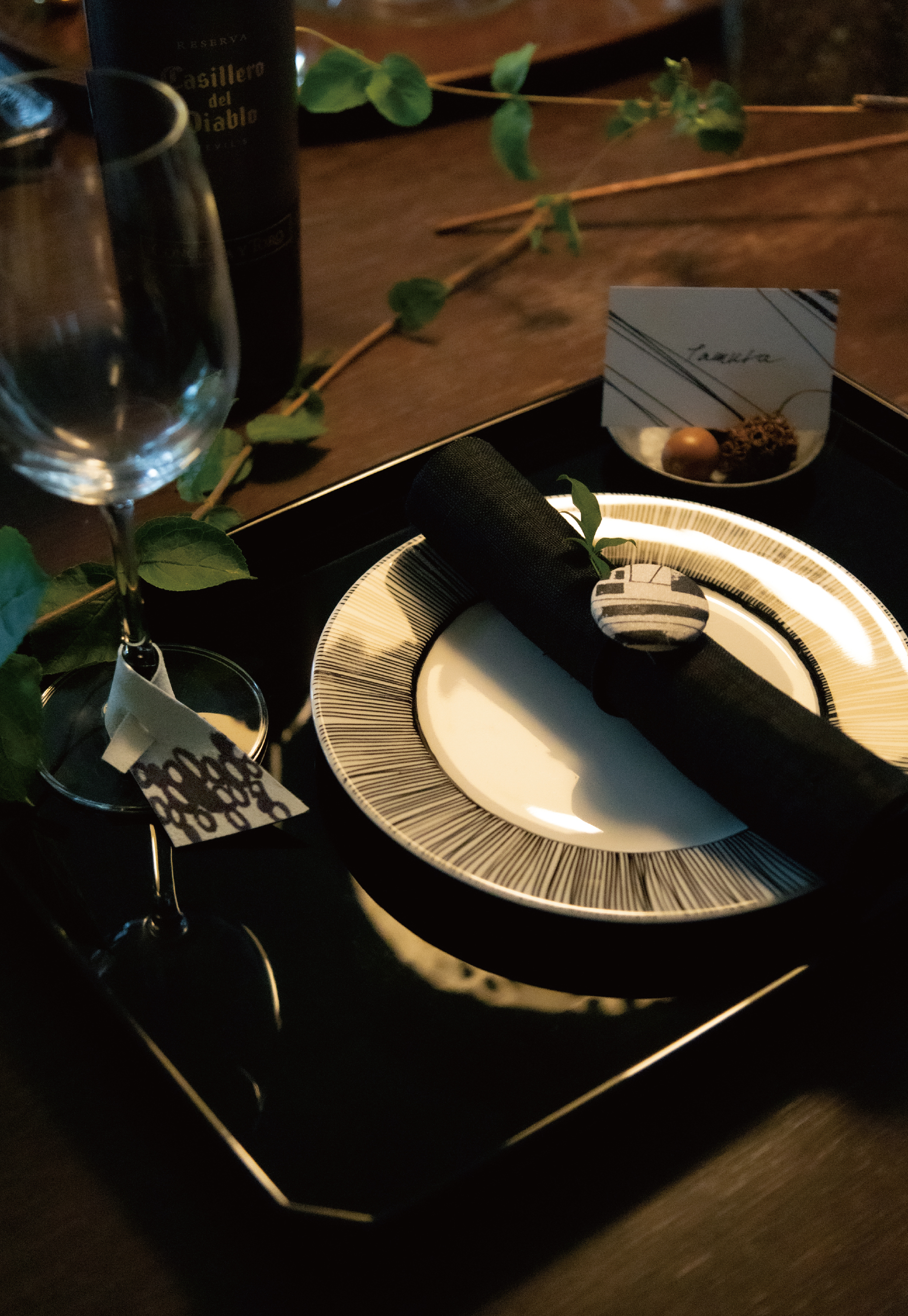 食卓には、絵皿/グラスマーカー/箸袋とランチョンマットなど