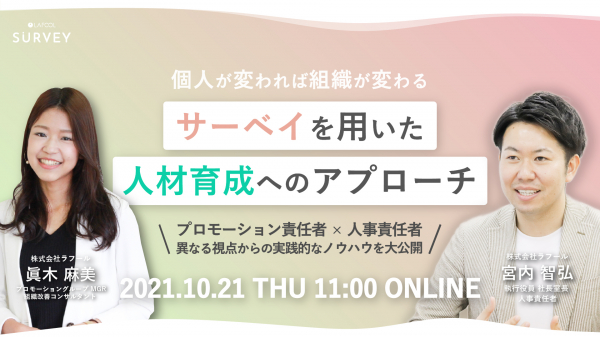 株式会社ライトアップ(本社:東京都渋谷区、代表取締役社長:白石崇、以下ライトアップ)と、株式会社ラフール(本社:東京都中央区、代表:結木啓太 、以下ラフール)は人材育成の課題を解決するサーベイ運用ノウハウを解説する無料オンラインセミナー「【個人が変われば、組織が変わる】サーベイを用いた人材育成へのアプローチ」を共同で開催いたします。