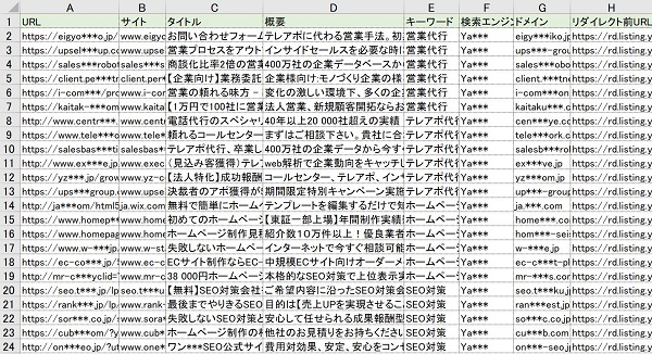 【タイトル】【概要】【キーワード】【URL(広告掲載)】【URL(リダイレクト前)】【ドメイン】【検索エンジン】