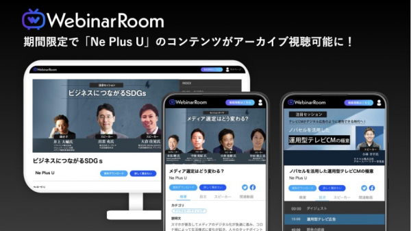 株式会社ヒトクセ(本社:東京都新宿区、代表取締役:宮崎航。以下「ヒトクセ」)が提供するウェビナー動画のプラットフォーム「Webinar Room(ウェビナールーム)」にて、2021年10月14日(木)より期間限定で株式会社ナノベーション(本社:東京都渋谷区、代表取締役:中野博文。以下「ナノベーション」)主催の「Ne Plus U(ネプラス・ユー)」のコンテンツがアーカイブ視聴可能になります。