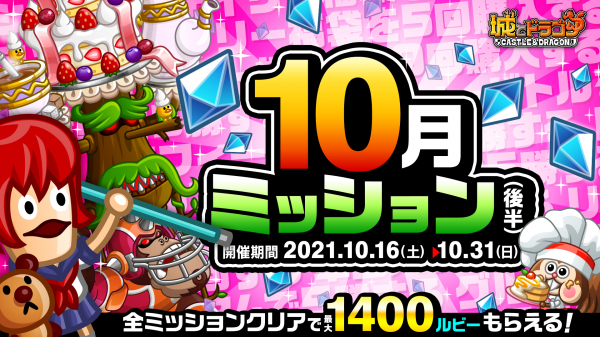 株式会社アソビズム(本社:東京都千代田区、代表取締役:大手智之)は、App Store・Google Playにて好評配信中の『城とドラゴン』で、「10月ミッション(後半)」を2021年10月16日(土)より開催いたします。