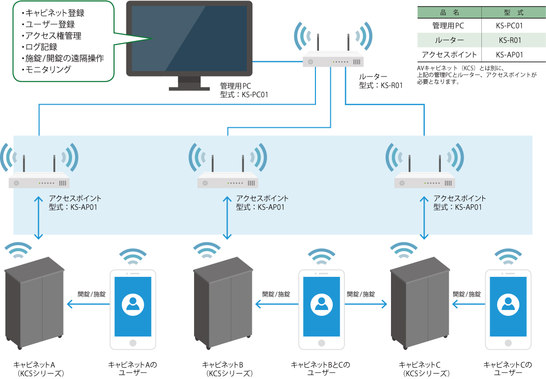 (管理用 PC KS-PC01、ルーター: KS-R01、アクセスポイント: KS-AP01