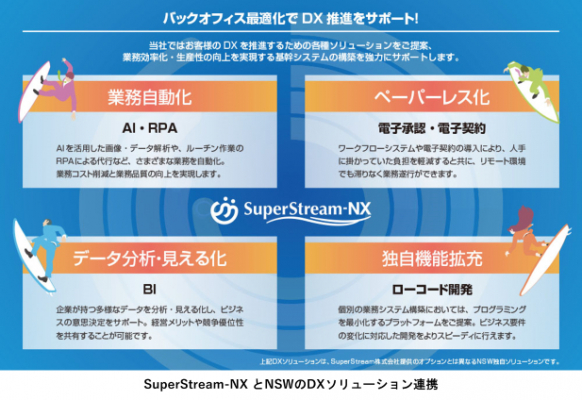 今後もNSWは、SuperStream-NXの導入へ向けたコンサルティング、インフラ構築や各種周辺ソリューションとの連携、保守サポートまで対応し、企業のバックオフィス業務を支えるDX経営基盤として幅広い業種業態へ展開してまいります。