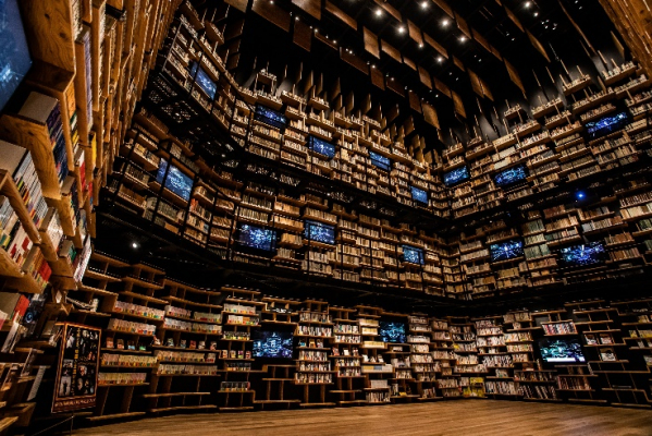 「ところざわサクラタウン」内に誕生した「角川武蔵野ミュージアム」のメインスポット。高さ約8メートルの巨大本棚に囲まれた図書空間。「本と遊び、本と交わる」をコンセプトにプロジェクションマッピングを上映する。約3万冊の本が配架されている。