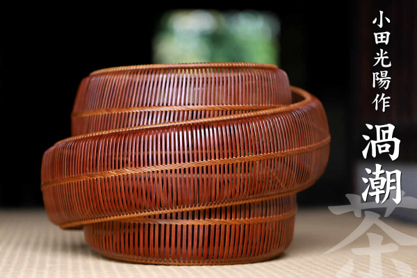 竹工芸作家の小田光陽(おだ こうよう)氏は大阪の指物師、三好弥次兵衛に師事し、指物大工をしていましたが、50歳を過ぎてから竹工芸の世界へ入りました。木工技術を生かし、竹と木の組み合わせによる作品を手掛け、竹工芸の新たな可能性を追求。縦ひごを渦巻状にして豪快な渦潮を表現した花器を多く手掛けた作家です。
