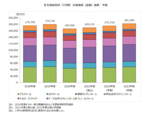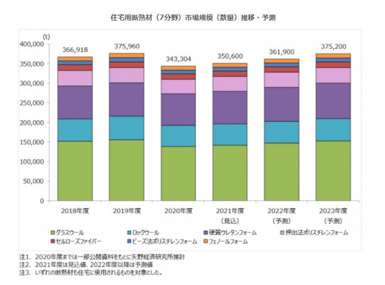今後は2025年度以降の新設住宅の省エネ基準適合義務化に向けて、ハウスビルダーや地域工務店などでも高断熱化に向けた取組が増加することから、断熱材市場は拡大する見通しである。