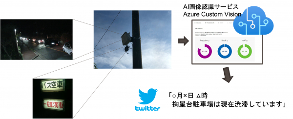 2021年7月~8月にかけて、道路状況と満車・空車の看板を撮影する2台のカメラを駐車場付近に設置し撮影。収集した道路の画像データを使って、Custom VisionでAIを学習させました。そのデータを同駐車場に設置したコンピュータからAIクラウドサービス(※Azure Custom Vision)とTwitterへ通信させることで、画像から物体認識等を行うことができるシステムを開発しました。