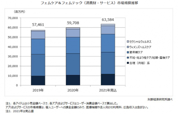 本調査においては、生理(月経)系、不妊・妊よう性ケア/妊娠・産後ケア、更年期ケア、ウィメンズヘルスケア、セクシャルウェルネスの5分野のアイテム・サービスを対象として市場規模を推計した。2020年のフェムケア&フェムテック(消費財・サービス)市場規模は前年比103.9%の597億800万円であった。