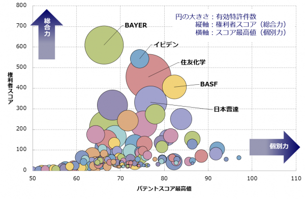 今調査では日本の特許庁で公開されている「殺菌・殺カビ剤技術」(FI=A01P 3/00)全般について、個別特許の注目度を得点化する「パテントスコア」をベースに、特許の質と量から総合的に見た評価を行いました。
