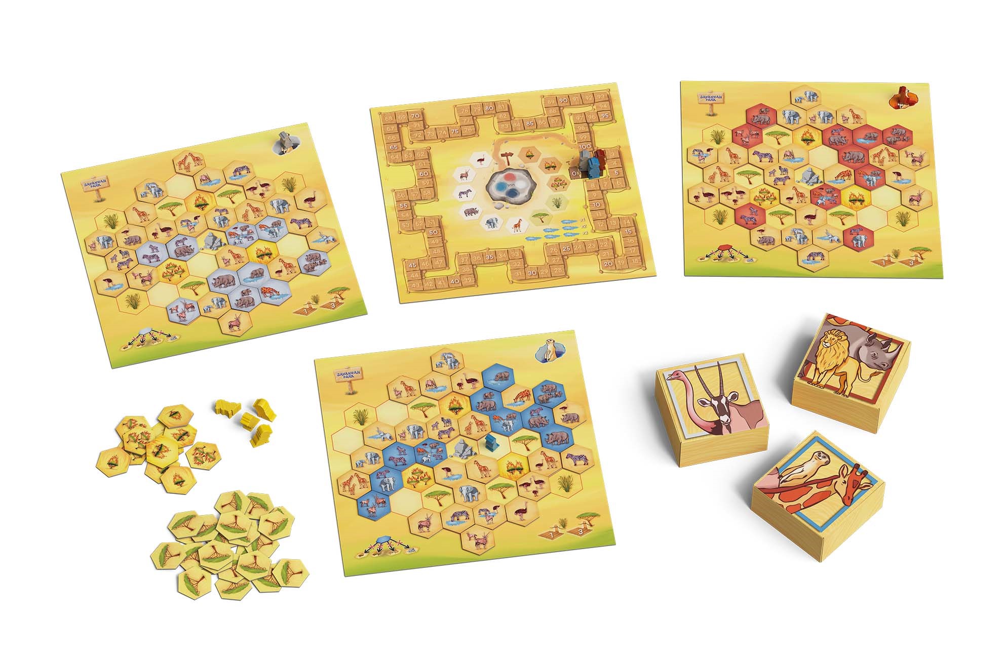 『サバンナパーク』では、プレイヤーは自分の公園にランダムに配置された動物トークンを移動し適切な配置を目指します。