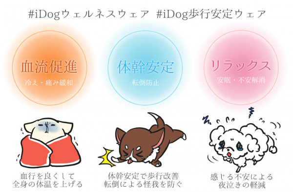 「IDOGウェルネスウェア」は高機能素材を固着したドッグウェアで、着用する愛犬・愛猫にリラックス状態、血流の促進、体幹安定効果による歩行時の転倒・ふらつきを予防する目的で企画しました。