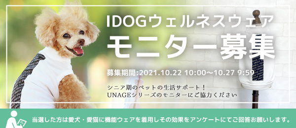 大好きなお散歩をずっと楽しめる健康的な生活をサポートしたいという考えから「IDOGウェルネスウェア」を企画し、まずはシニア期のペット達に効果を感じて欲しいと思い、モニター様を公募いたします。