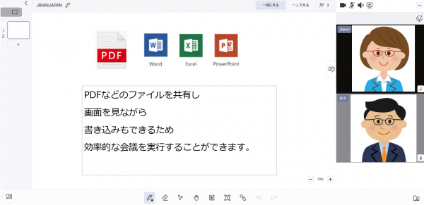 ドラッグアンドドロップで簡単にファイル共有しながら発表することができます。ホワイトボードでは書き込み機能を使用して、共有された資料画面にメモを残しながら話すことでより明確な意思伝達ができます。
