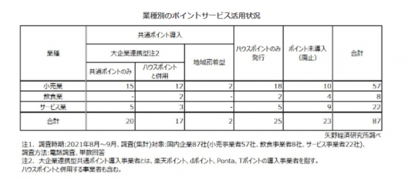 株式会社矢野経済研究所(代表取締役社長:水越孝)は、国内の大手・中堅企業(小売事業者、飲食事業者、サービス事業者等)を対象として、共通ポイント・ハウスポイントの活用に関して電話による法人アンケート調査を実施いたしました。ここでは、各事業者のポイントサービス活用状況や共通ポイント導入事業者における今後のポイントサービスに関する方向性について、その分析結果の一部を公表いたします。