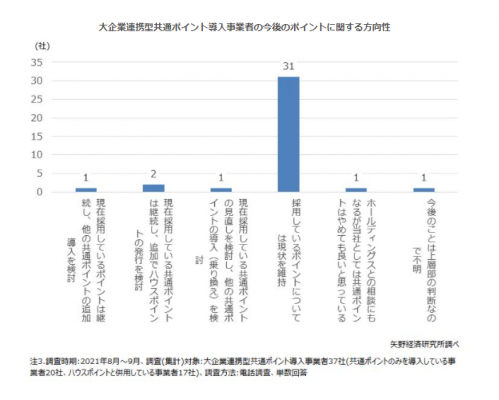 次に、大企業連携型共通ポイント導入事業者(37社)に対して、今後のポイントサービスに対する意向を尋ねたところ、8割以上(31社)が「採用しているポイントについては現状を維持」と回答した。一方、一部の事業者では、より集客力の高い共通ポイントへの乗り換え検討(1社)や、更なる集客力向上に向けて追加で共通ポイントの導入を検討するケース(1社)があった。