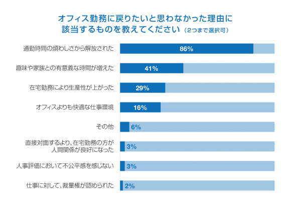 「オフィス勤務に戻りたくない」要因は、1位「通勤時間から解放された」 (86%) 、2位「趣味や家族との時間が増えた」 (41%) 、3位「在宅勤務による生産性の向上」(29%)となりました。1位と2位、いずれも時感を有効に使えることに起因する結果となりました。