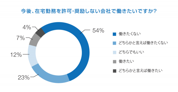 最後に「今後、在宅勤務を許可・奨励しない会社で働きたいか」という質問を投げかけたところ、1位「働きたくない」(54%)、2位「どちらかと言えば働きたくない」(23%)との答えが返ってきました。あわせて77%となり在宅勤務の有無は、優秀な人材を引き付けるカギとなりそうです。