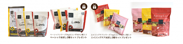 「POCHIザ・ドッグフード」シリーズの「ベーシック」いずれか1kg以上ご購入の方には「POCHI ベーシックお試し3種セット」おひとつ、「エイジングケア」いずれか1kg以上ご購入の方には「POCHI エイジングケアお試し3種セット」おひとつを各先着1000名さまにプレゼントします。