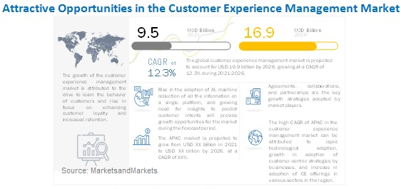 MarketsandMarketsは公開資料において、世界のカスタマーエクスペリエンス管理市場は2021年中に95億ドル、2026年までには169億ドルに成長し、予測期間の年平均成長率(CAGR)は12.3%になるとの予測結果を発表しました。カスタマーエクスペリエンス管理市場の主な市場成長促進要因としてはカスタマーエンゲージメントの改善と顧客解約率の削減に対する必要度の上昇、顧客の理解を深める必要性、より良いカスタマーエンゲージメント戦略立案における顧客関連スコアの活用などが挙げられます。