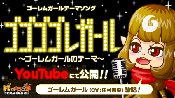 「ゴーレムガール」のテーマソング「ゴゴゴゴレガール~ゴーレムガールのテーマ~」のPVを『城とドラゴン』公式YouTubeチャンネルにて公開いたしました。本楽曲は、田村奈央さんがキャラボイスを担当した「ゴーレムガール」が歌うキャラテーマソングで、作曲はアソビズムのサウンドクリエイター・コジマリョウスケが担当しております。また、ゲーム内でも条件を満たすことで本楽曲を入手することができ、ゲーム中のBGMに設定することが可能になります。11月登場の新キャラ“ゴーレムガール”が歌う「ゴゴゴゴレガール~ゴーレムガールのテーマ~」を、ぜひご視聴ください!